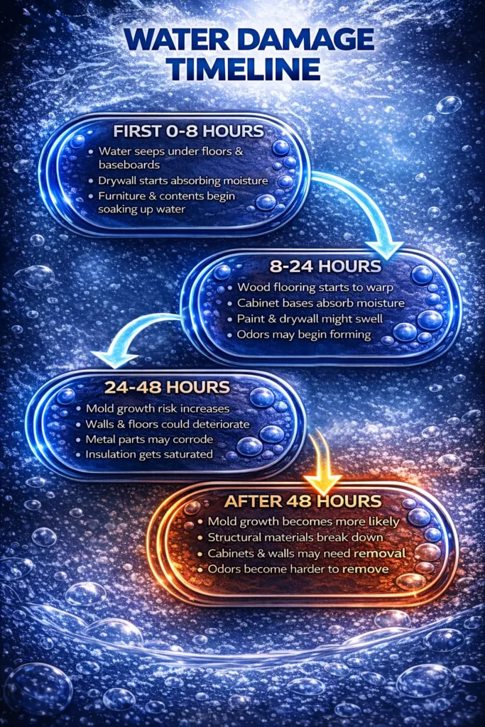 Water damage can develop quickly—and understanding the timeline can help you respond sooner. From the first few hours to days later, moisture can affect flooring, walls, and other materials throughout your home.