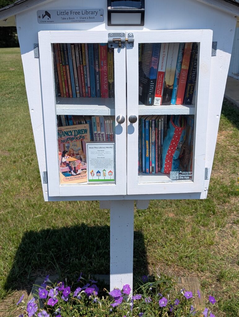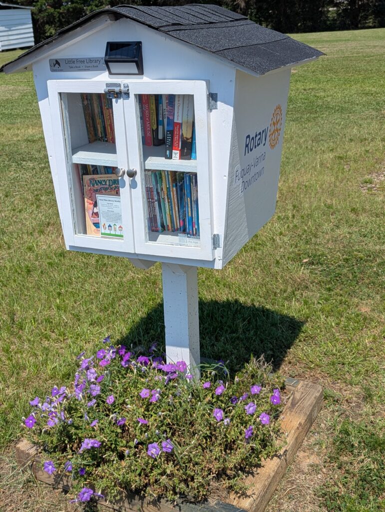 School is out for summer – and we have opened our Free Little Library (Charter #204902)! Located next to the Middle Creek Insurance office at 9704 Fayetteville Road, Raleigh NC 27603, this Free Little Library was built by Joe Boos for the Downtown Fuquay-Varina Rotary Club. Members from the Rotary Club came out to install and paint the library (and to add some flowers!). Located just off Highway 401 (the intersection of Ransdell Road and Fayetteville Road), this library is open, full of elementary and middle school books, and we have added a few books for grownups, too! As part of the Rotary service projects to encourage literacy, The Downtown Fuquay-Varina Rotary Club has installed three (and counting!) little libraries around Fuquay-Varina.